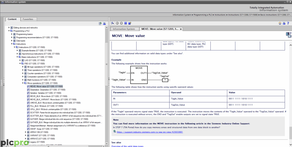 -et, a TIA Portal a hozzá tartozó dokumentációt nyitja meg. - Például, ha a „Move” utasításon állsz, az